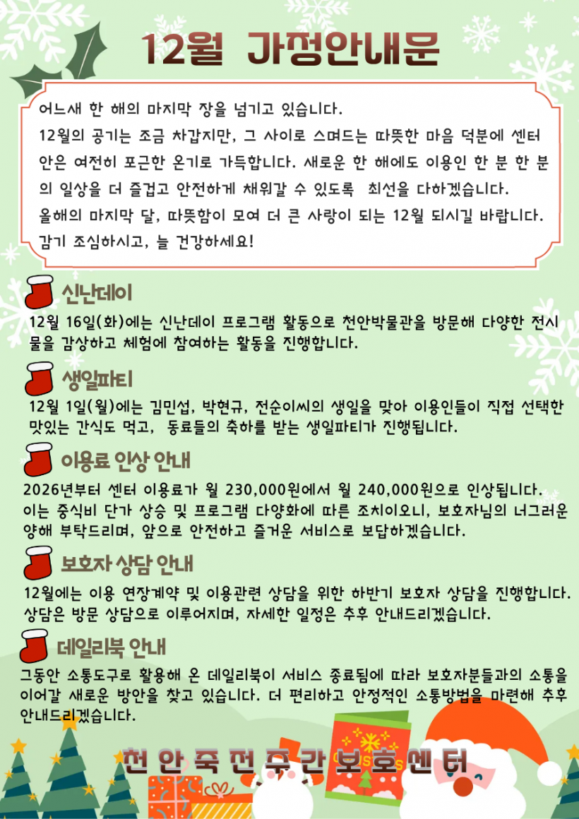 2025년 12월 가정안내문 페이지 정보 작성자 김미리 작성일25-11-28 15:20 조회187회 댓글0건 이전글 다음글 목록 본문 12월 가정안내문 입니다. 댓글목록 등록된 댓글이 없습니다. 이전글 다음글 목록