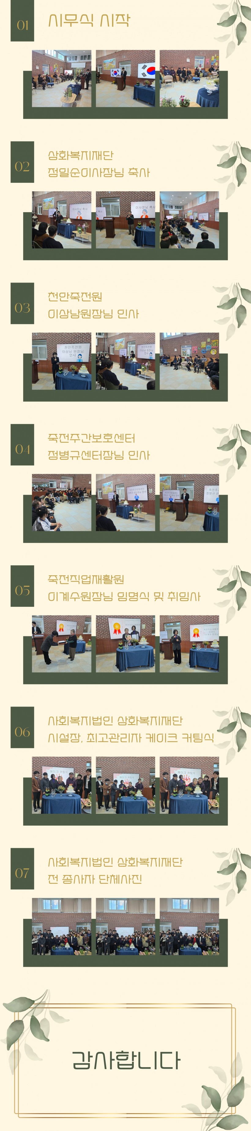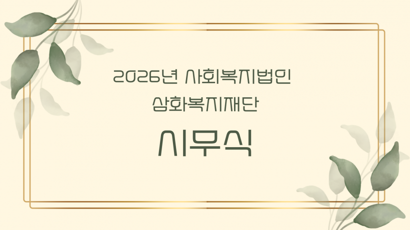 2026년 사회복지법인 삼화복지재단 시무식 페이지 정보 작성자 운영자 작성일26-01-02 17:56 조회130회 댓글0건 관련링크 목록 본문 2026년 사회복지법인 삼화복지재단 시무식 진행하였습니다.2025년 잘 마무리 진행하였고 새롭게 2026년 시작하였습니다.2025년에 사랑과 나눔, 후원, 봉사를 진행해주신 모든 분들께 감사드리며 2026년에도 잘 부탁드립니다.새해 복 많이 받으세요! 댓글목록 등록된 댓글이 없습니다. 목록