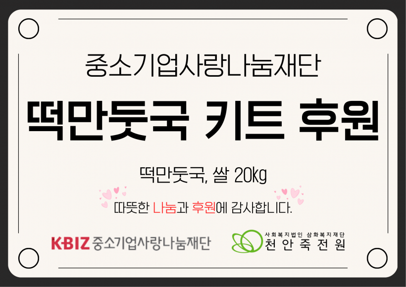 중소기업사랑나눔재단 떡만둣국키트, 쌀 후원 페이지 정보 작성자 운영자 작성일26-02-05 13:45 조회138회 댓글0건 관련링크 목록 본문 26.01.28.(수)중소기업사랑나눔재단 떡만둣국키트, 쌀 후원해주셨습니다.가족분들도 환하게 웃으시면서 맛있게 식사 하셨습니다.천안죽전원에게 사랑과 나눔을 해주신 중소기업사랑나눔재단에게 다시한번 감사의 말씀을 드립니다.감사합니다. 댓글목록 등록된 댓글이 없습니다. 목록