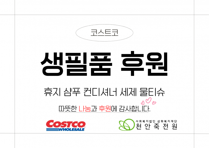 코스트코 생필품 후원 페이지 정보 작성자 운영자 작성일26-02-05 14:15 조회145회 댓글0건 관련링크 목록 본문 26.02.04.(수)코스트코 천안지점에서 휴지, 샴푸, 컨디셔너, 세제, 물티슈를 후원해주셨습니다.천안죽전원 가족분들이 일상생활에서 잘 사용하실 수 있도록 지원하겠습니다.천안죽전원에게 사랑과 나눔을 해주신 코스트코에게 다시한번 감사의 말씀을 드립니다.감사합니다. 댓글목록 등록된 댓글이 없습니다. 목록