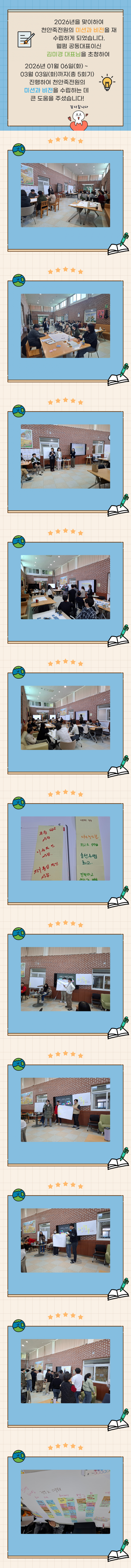 미션&비전 교육 페이지 정보 작성자 운영자 작성일26-03-16 16:16 조회192회 댓글0건 관련링크 목록 본문 2026년 01월06일 부터 03월 03일까지 미션,비전 교육 진행하였습니다.기관에 대한 정체성과 직원분들의 장점, 업무적인 시너지들을 알 수 있는 좋은 시간이였습니다. 댓글목록 등록된 댓글이 없습니다. 목록